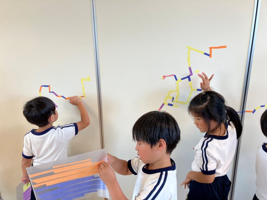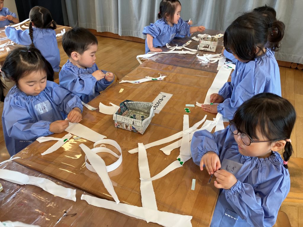 そこでは、完成度の高い作品を目指すのではなく、素材に触れながら発見する喜びや、自分の思いを形にしていく過程そのものが大切にされています。壁いっぱいにテープを貼って道をつくったり、友だちと協力して大きな作品に仕上げたりする姿からは、想像力や協調性の芽生えが見て取れます。造形あそびは、子どもたちにとって「表現することは楽しい!」と感じられる時間となっています。