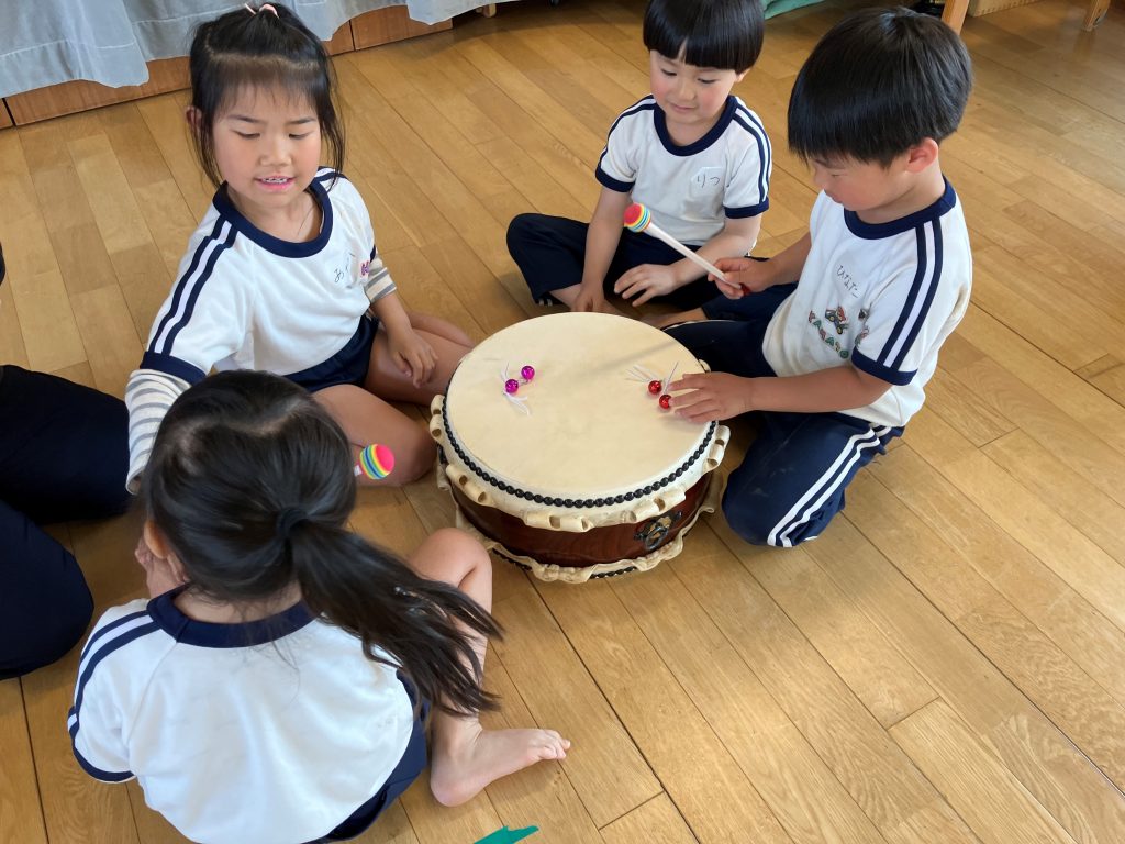 音楽あそびでは、リズムに合わせて体を動かしたり、太鼓や鈴・カスタネットなどの小楽器を自由に鳴らしたりします。太鼓を囲んで「どんな音が出るかな?」と耳を澄ませる子、友だちと一緒にリズムを刻みながら自然に笑顔があふれる子など、その表情はとても生き生きしています。